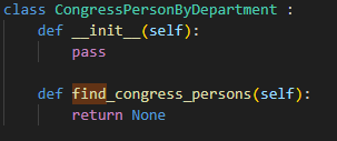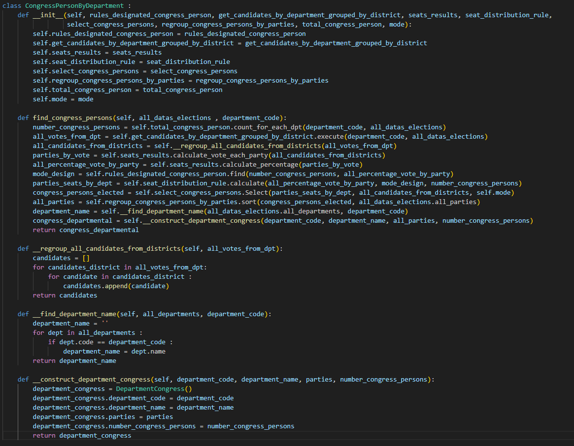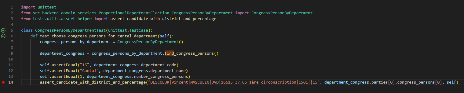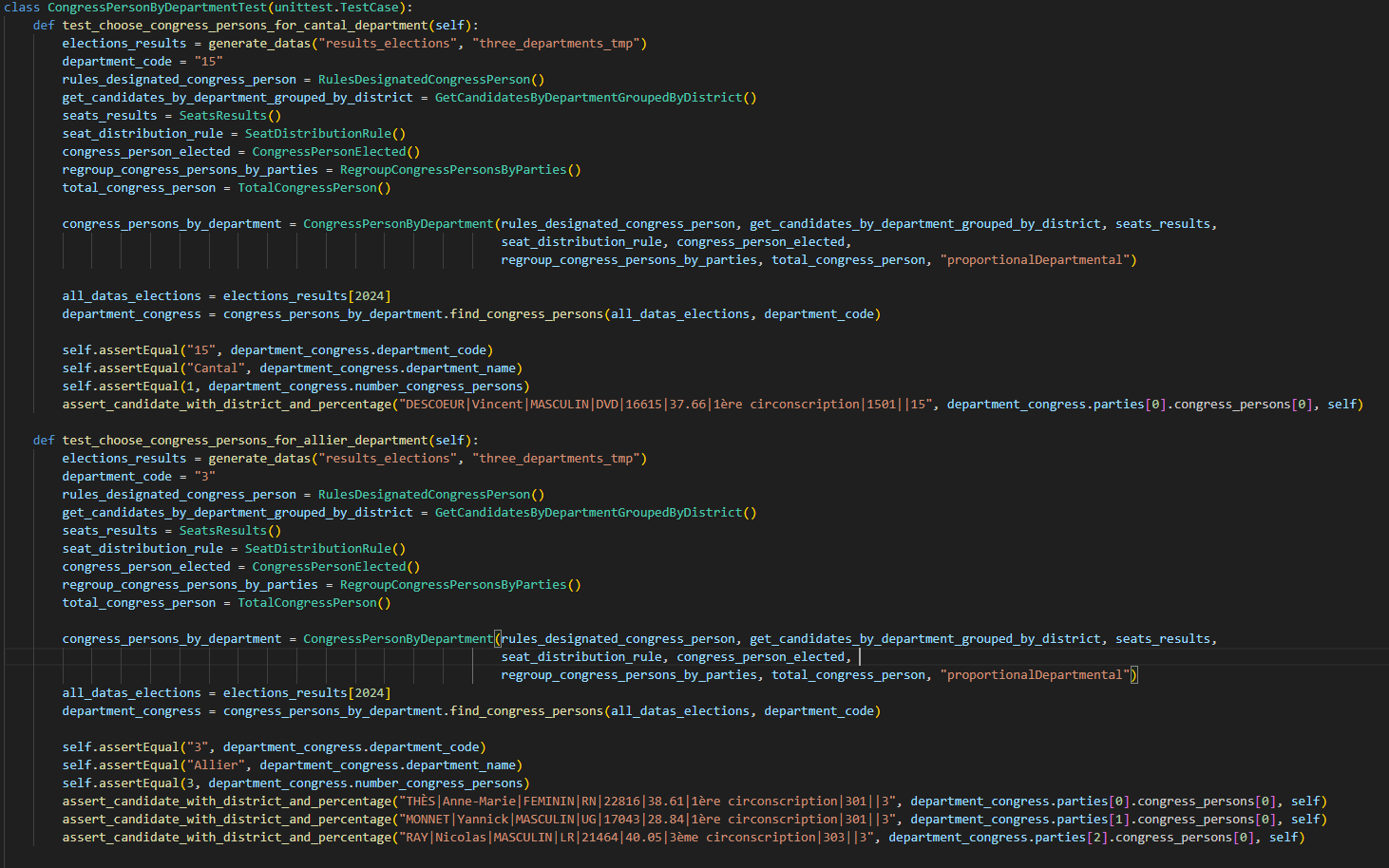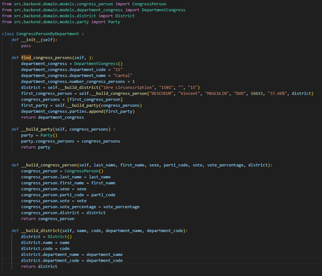 7 – Maintenant on va faire la même chose pour toutes les autres sous-fonctionnalités. Après les avoir développées et les avoir faites appelées par la classe CongressPersonByDepartment permettant de faire fonctionner la feature principale, le code final de la feature ressemble à ça :
