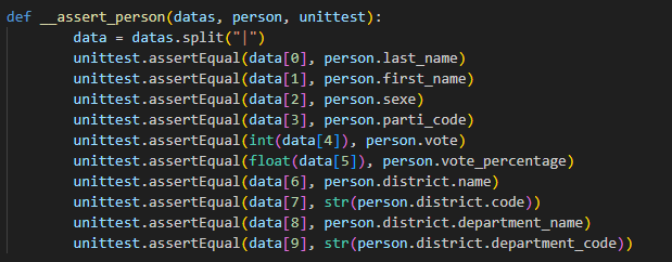 Dans ce test, la méthode Select de la classe CongressPersonElected doit sélectionner dans chacun des circonscriptions passées en paramètre le candidat élu. La partie « expected » est une chaîne de caractère regroupant les données du candidat élu attendu avec pour séparateur |.