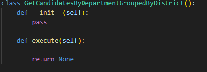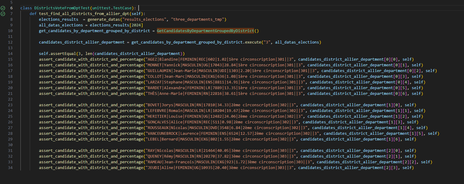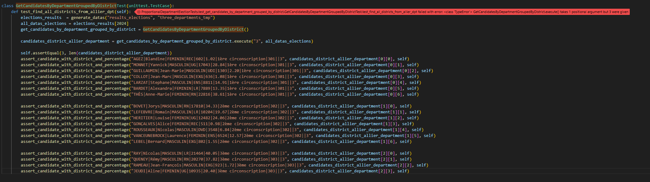 4 – Comme on le voit dans la partie 2, cette fonctionnalité possède des sous-fonctionnalités. Maintenant, on va commencer par le développement de la sous-feature « On compte combien de députés possède ce département ». Elle sera développée dans la classe « GetCandidatesByDepartmentGroupedByDistrict.
