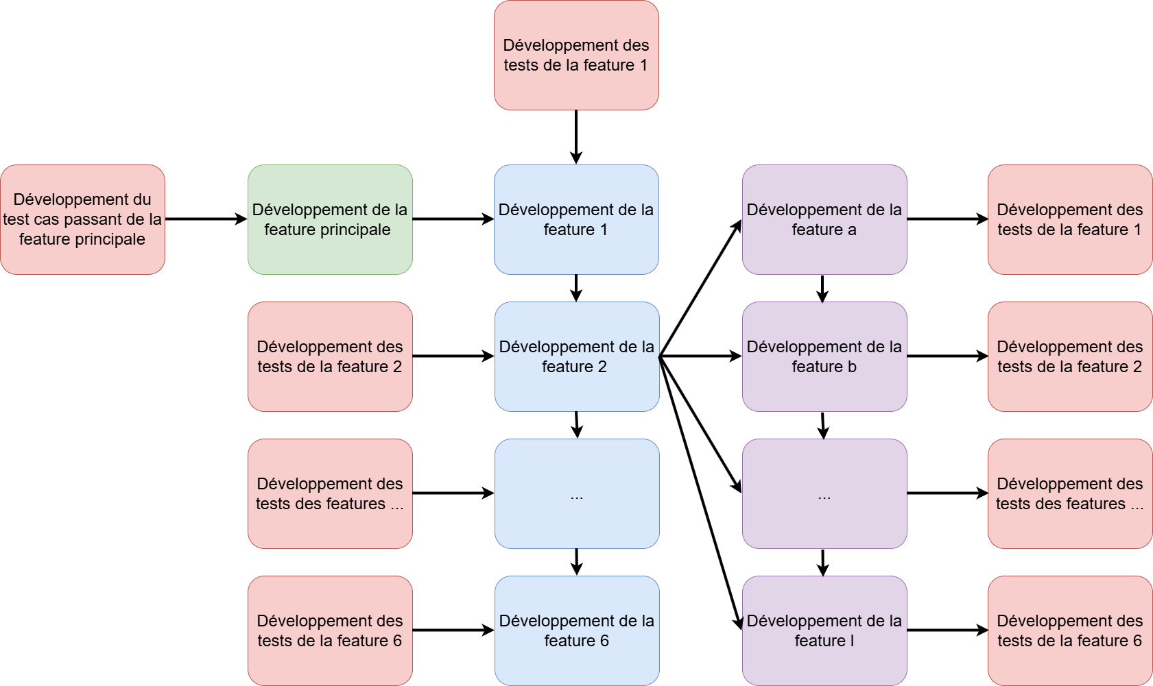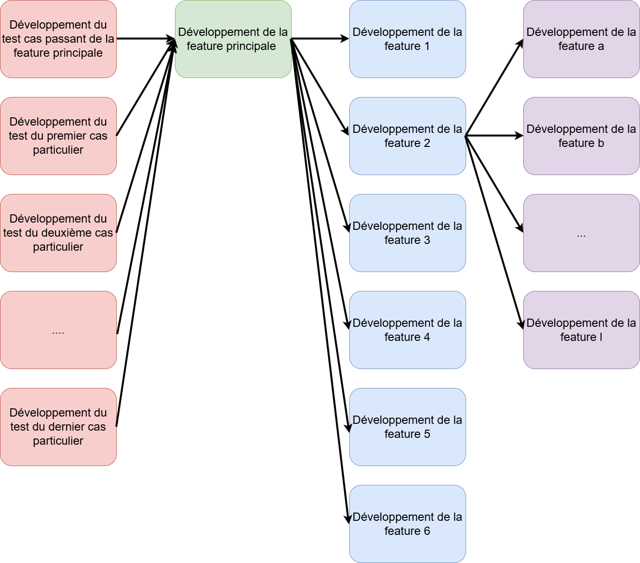 Si on reprend l’exemple au-dessus, vous pouvez développer la feature 2 si ses sous features (a, b, c…) ont été développées en TDD avant.