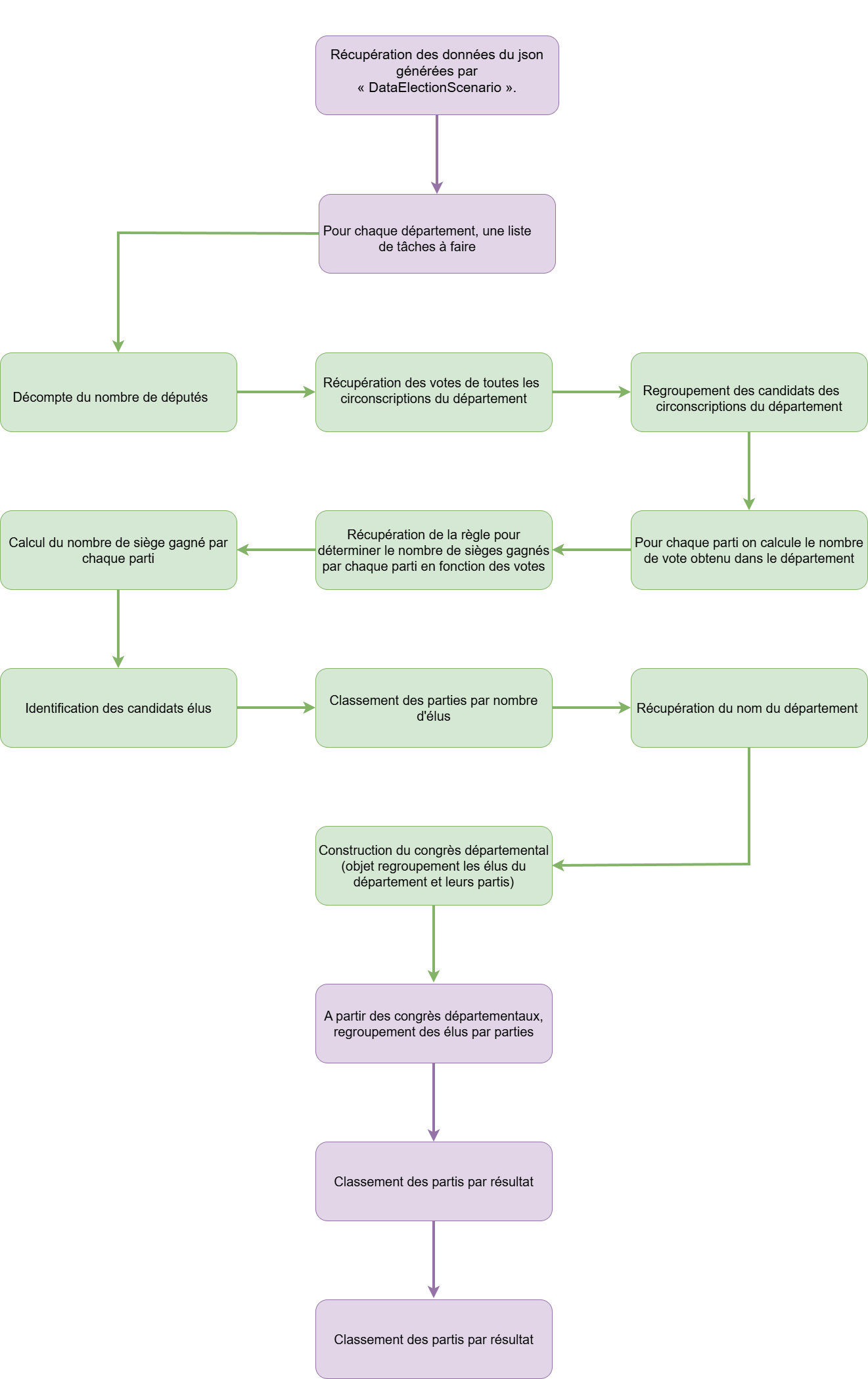 Workflow de la simulation d’élections avec la règle « Proportionnelle départementale ».