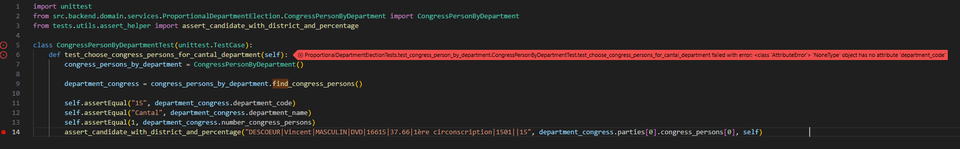 7 – Maintenant on va faire la même chose pour toutes les autres sous-fonctionnalités. Après les avoir développées et les avoir faites appelées par la classe CongressPersonByDepartment permettant de faire fonctionner la feature principale, le code final de la feature ressemble à ça :